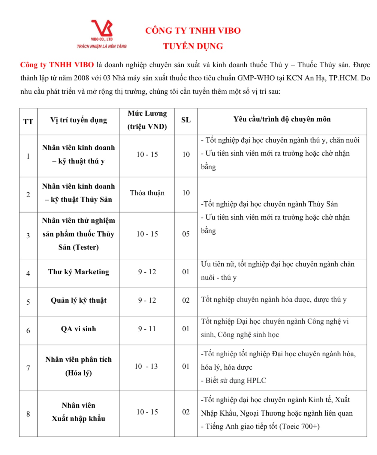 TUYỂN DỤNG CÔNG TY VIBO T08/2025