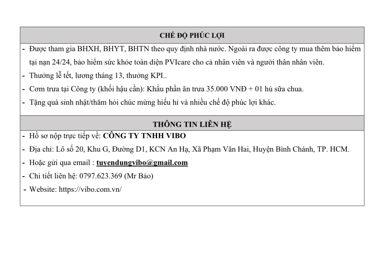 TIN TUYỂN DỤNG CÔNG TY TNHH VIBO QUÝ II-2025