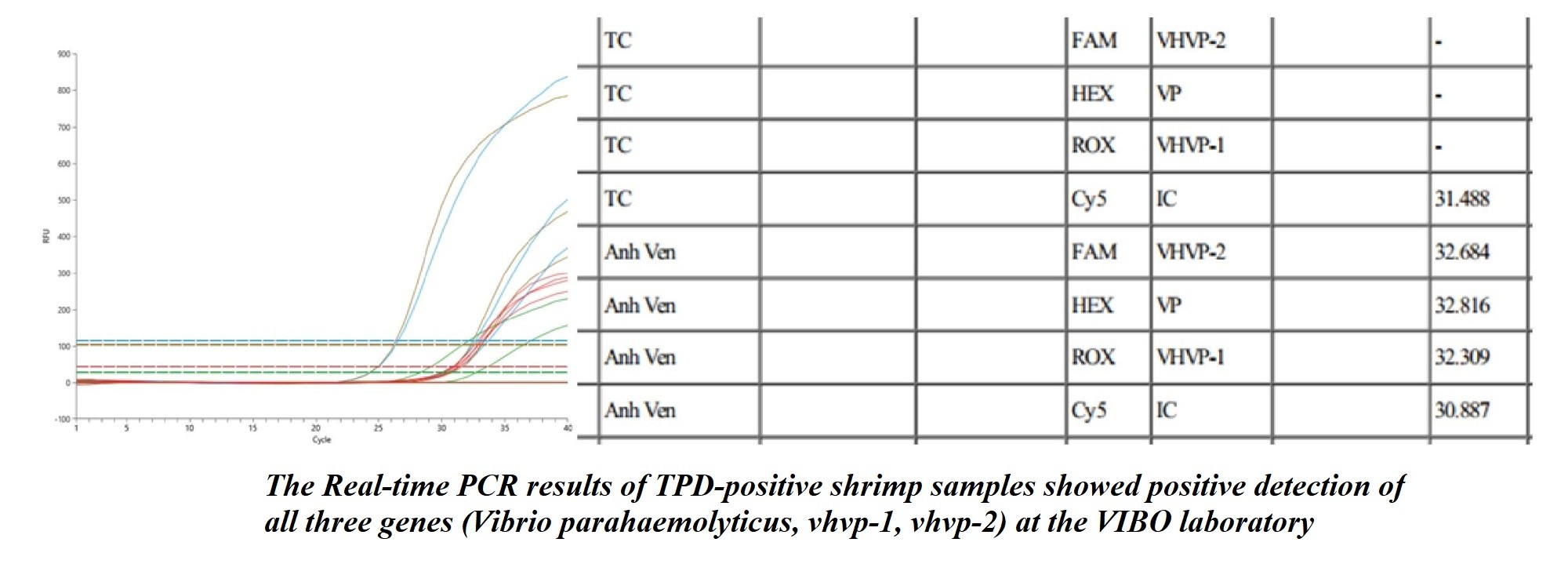 Figure 4: Real-time PCR results showing positive amplification of three genes (V. parahaemolyticus, vhvp-1, vhvp-2) for TPD-positive samples at VIBO Laboratory.