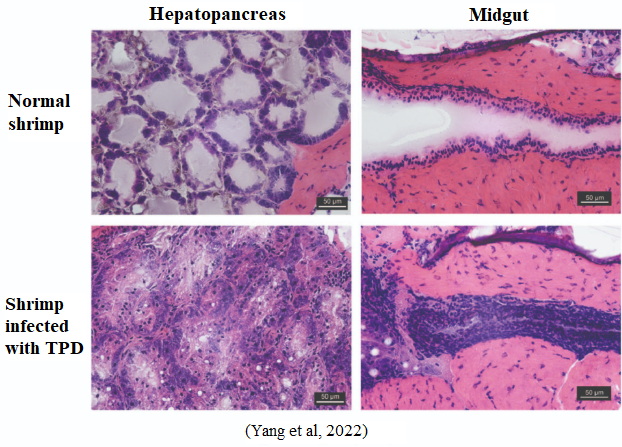 Figure 3: Histopathological comparison between normal shrimp and TPD-infected shrimp (hepatopancreas and midgut).