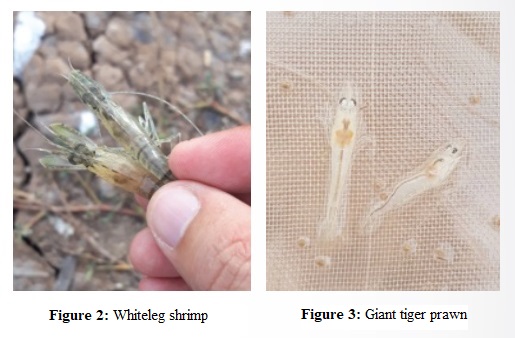 (Figures 2 & 3: Black tiger shrimp and whiteleg shrimp with early-stage hepatopancreatic disease)