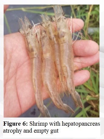 (Figure 6: Shrimp with shrunken hepatopancreas and empty gut)