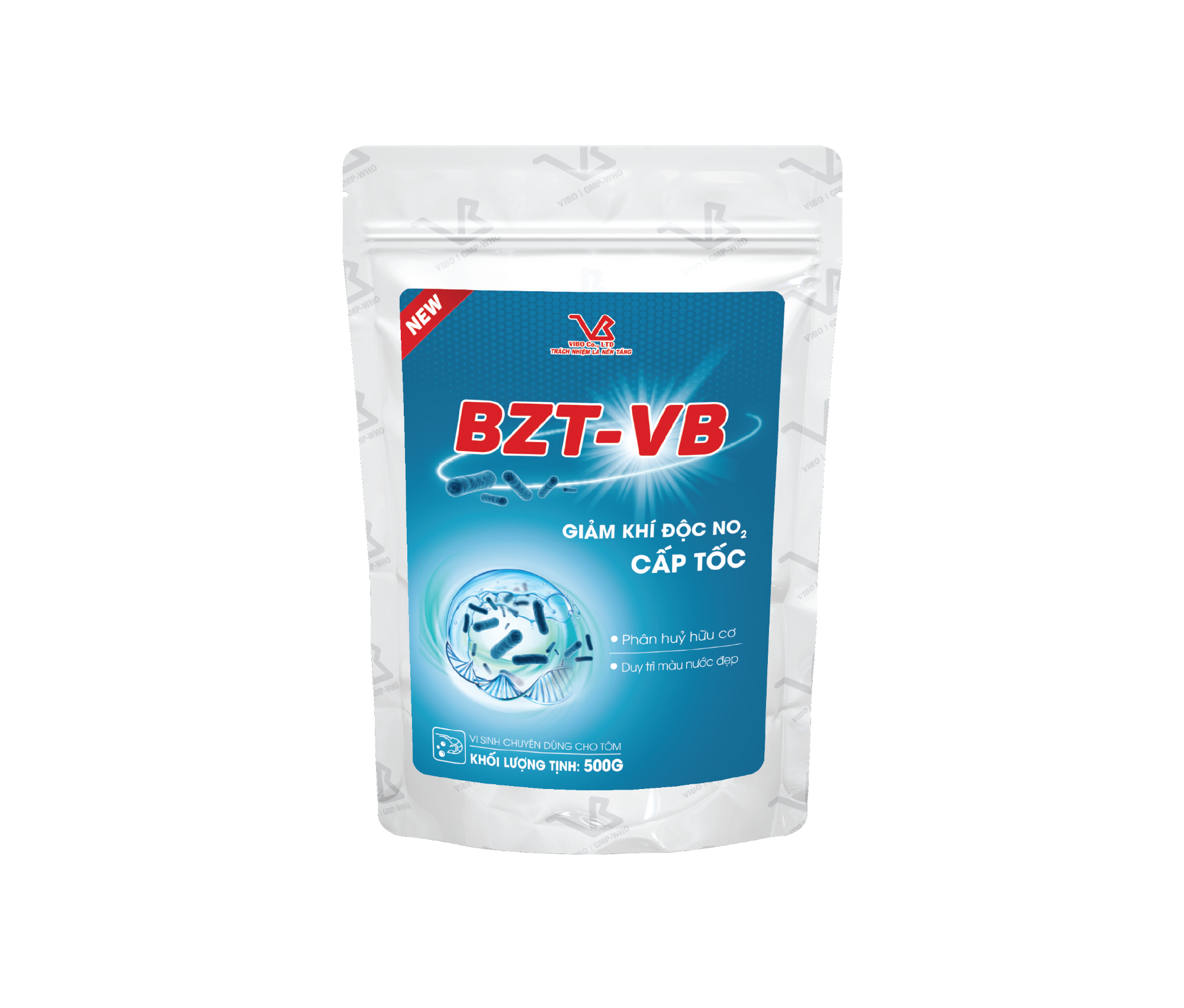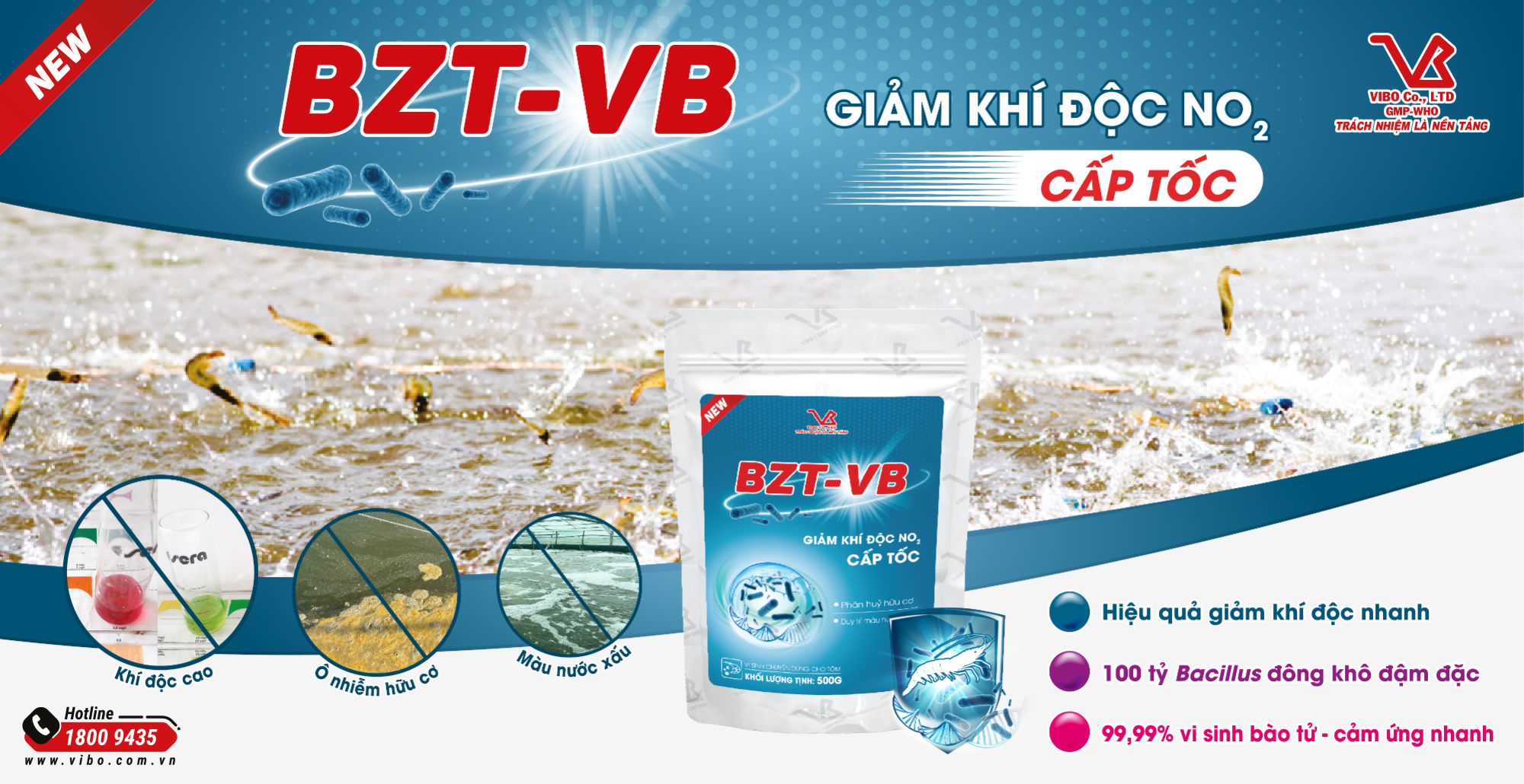 - Trường hợp khí độc NH3, NO2 cao, đáy ao ô nhiễm, mùi hôi thối: Dùng 500g BZT-VB new/1.000m3 nước, sử dụng 4-5 ngày liên tục.