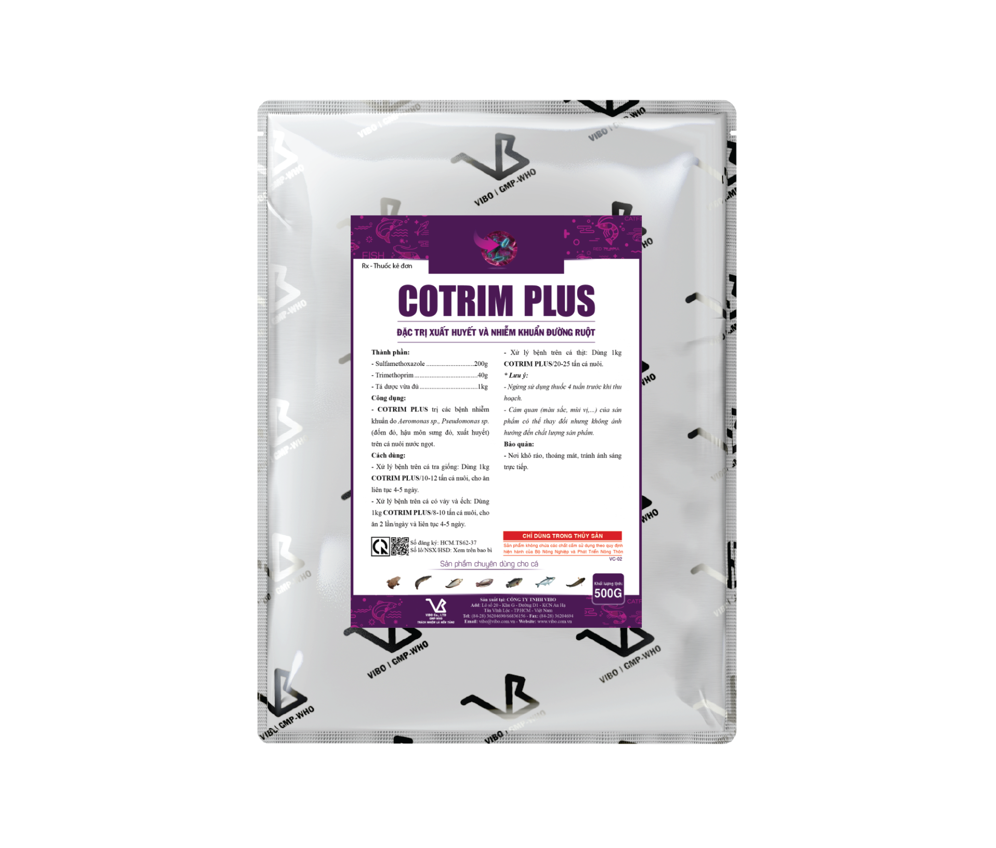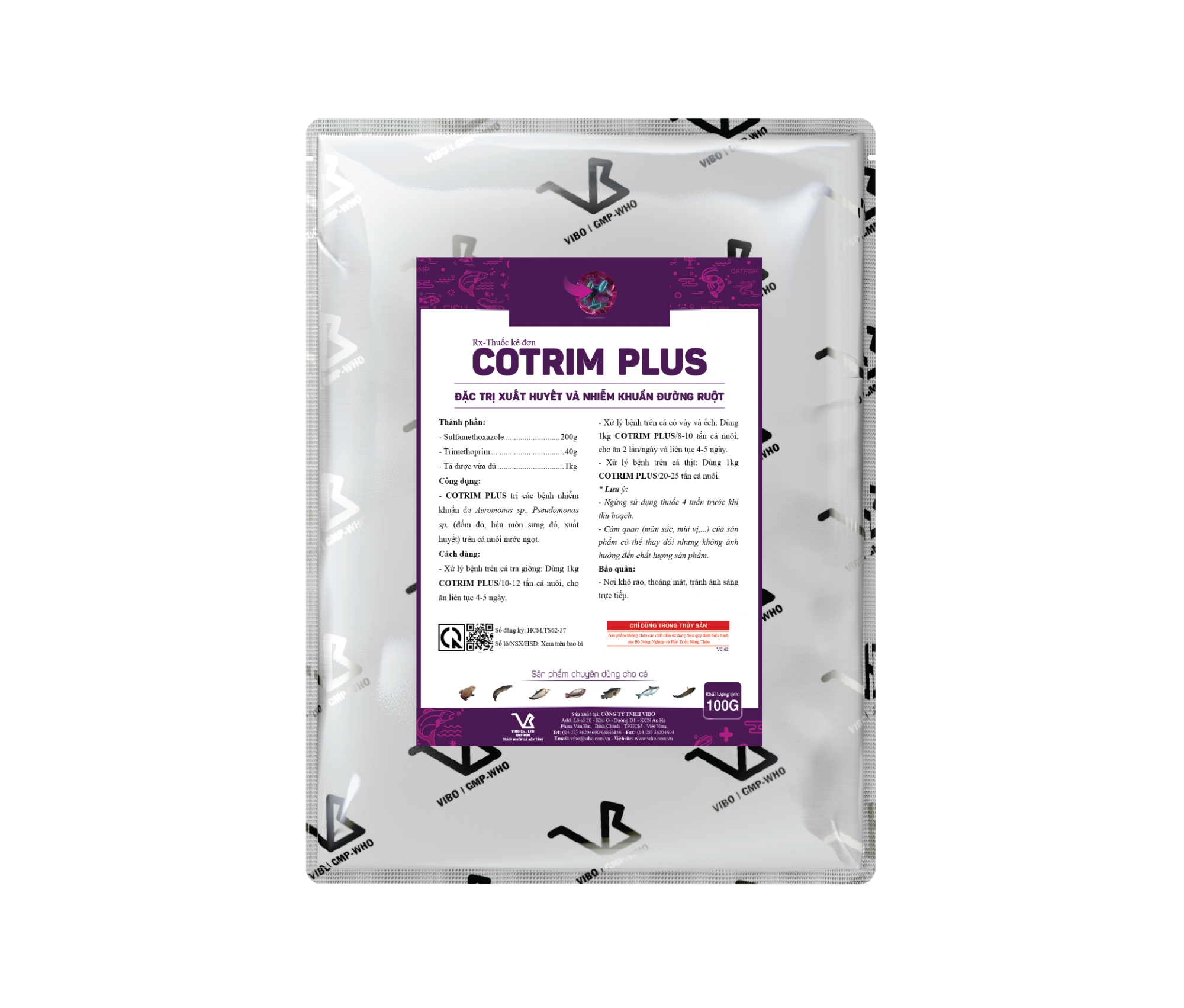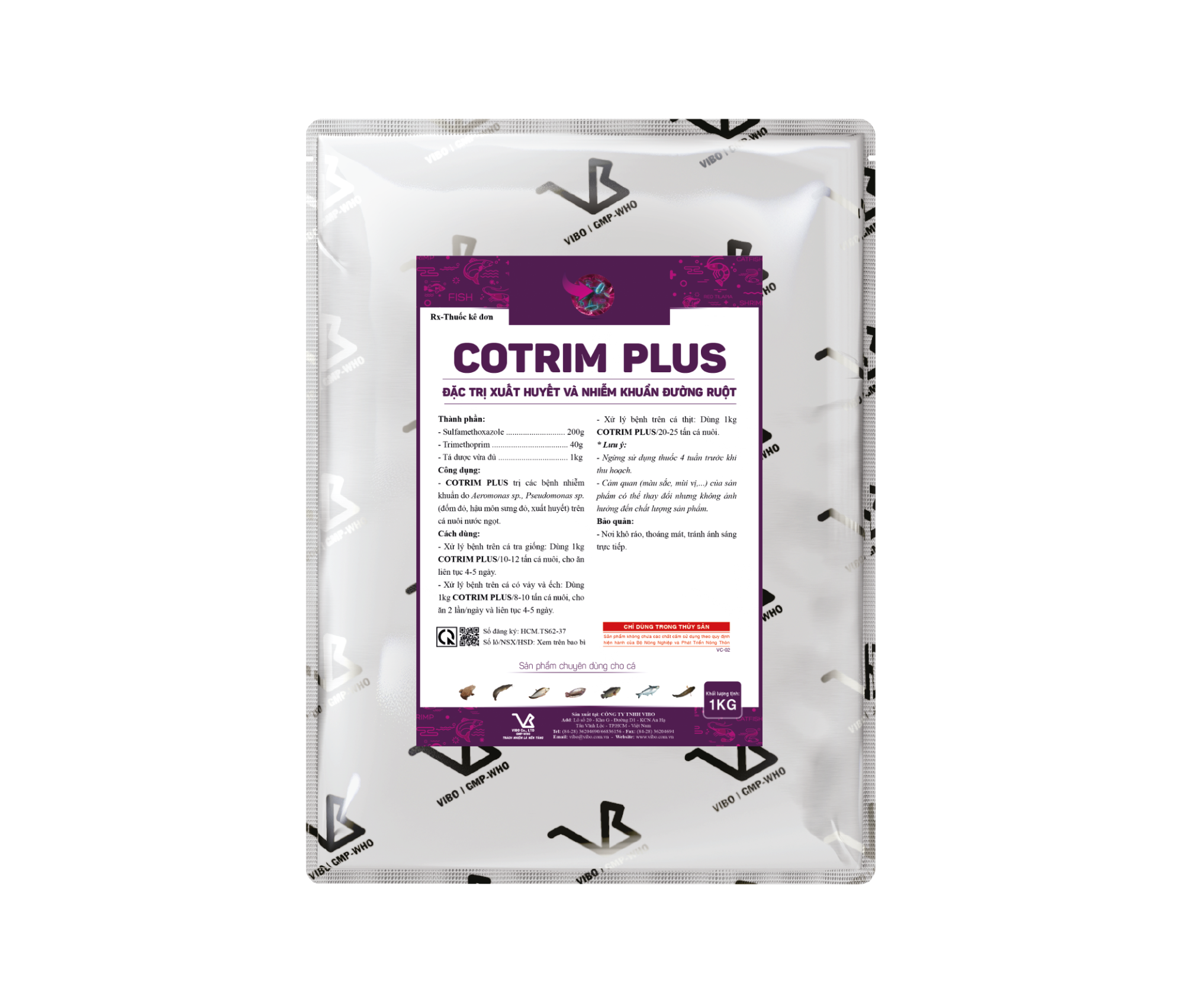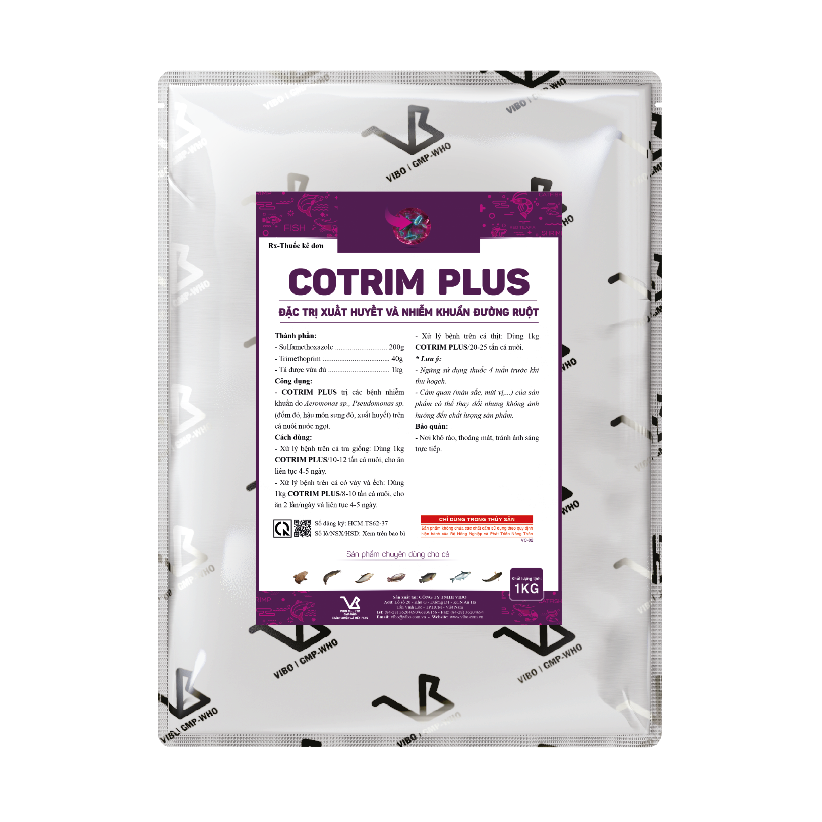 - COTRIM PLUS trị các bệnh nhiễm khuẩn do Aeromonas sp., Pseudomonas sp. (đốm đỏ, hậu môn sưng đỏ, xuất huyết) trên cá nuôi nước ngọt.