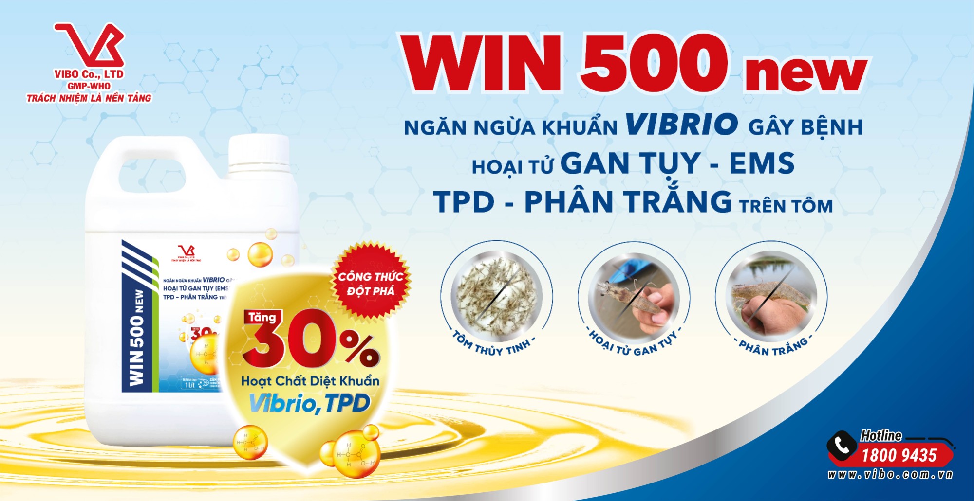 - Hạn chế vi khuẩn gây bệnh hoại tử gan tụy: Dùng 1 lít WIN 500 new/3.000-4.000m3 nước, định kỳ 7-10 ngày/lần.